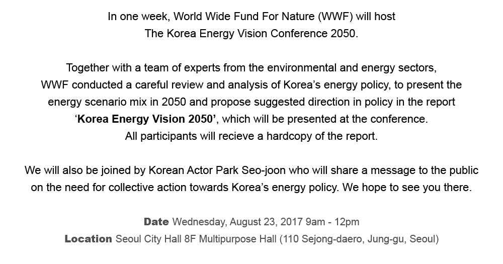 august 2017 23aug9:00 AM12:00 PM[WWF]The Korea Energy Vision Conference 2050External Events:External Events Event Details To see the full program, please click Event Details To see the full program, please click here. To register for the event, please click here. Time (Wednesday) 9:00 AM - 12:00 PM LocationSeoul City Hall 8F Multipurpose Hall110 Sejong-daero, Jung-gu, Seoul, Korea CalendarGoogleCal