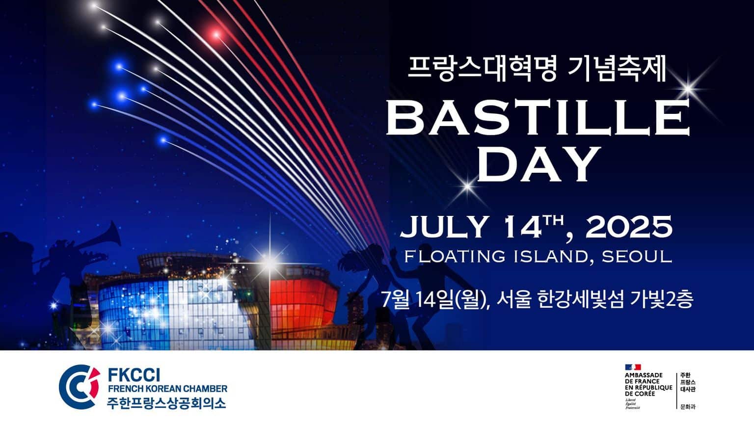 French Korean Chamber of Commerce and Industry (FKCCI) invites you to celebrate the Bastille Day, French National Day together in Korea together. The event is scheduled to take place on a Floating Island, Han River’s most beautiful venue, together with high-end French champagne, wine, and delicacies in the most festive of atmospheres. The program also offers variety of activities, such as diversity of F&B booths, Lucky Draw, live music performances to vibrant DJ sets, and more.