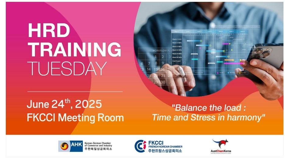 French Korean Chamber of Commerce and Industry (FKCCI), together with the Korean German Chamber of Commerce and Industry (KGCCI) and the Australian Chamber of Commerce in Korea (AustCham) invites you to the conference & seminar HRD Training “Balance the Load: Time & Stress in Harmony”. This training aims to explore ways to bring balance back to your professional life and optimization of performance while preserving well-being. Through this workshop you will be able to: