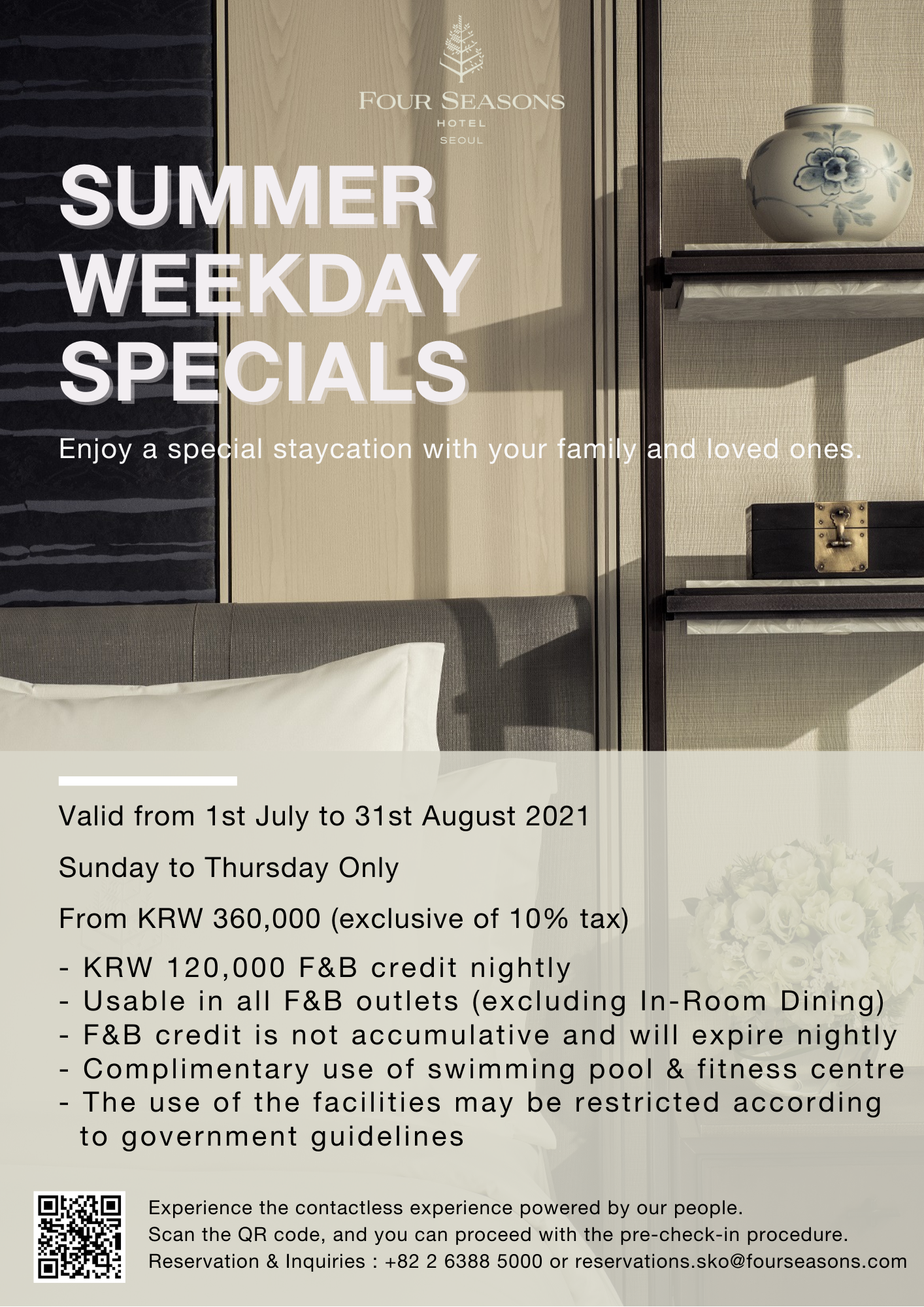 SUMMER WEEKDAY SPECIALS Enjoy a special staycation with your family and loved ones. Valid from 1st July to 31st August 2021 Sunday to Thursday Only From KRW 360,000 (exclusive of 10% tax) KRW 120,000 F&B credit nightly Usable in all F&B outlets (excluding In-Room Dining) F&B credit is not accumulative and will expire nightly Complimentary use of swimming pool & fitness centre The use of the facilities may be restricted according to government guidelines Reservations & Inquiries: Call 02.6388.5000 or email moc.snosaesruof@oks.snoitavreser