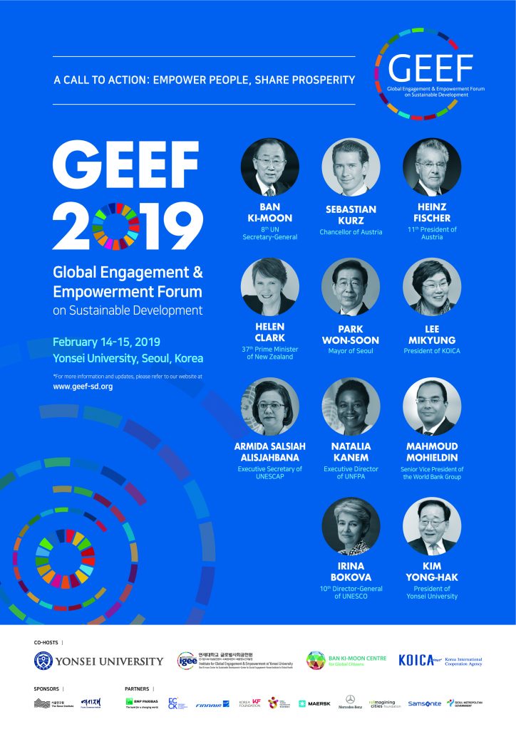 The Global Engagement & Empowerment Forum on Sustainable Development (GEEF), co-hosted by the Institute for Global Engagement & Empowerment (IGEE) and the Ban Ki-moon Centre for Global Citizens, is an annual international event where all stakeholders, including global leaders and experts, convene to collaborate towards accomplishing the United Nations’ 2030 Agenda for Sustainable Development. “A Call to Action: Empower People, Share Prosperity” as its main theme, GEEF 2019 will take place at Yonsei University on February 14-15. To learn more, please visit GEEF 2019 website at www.geef-sd.org