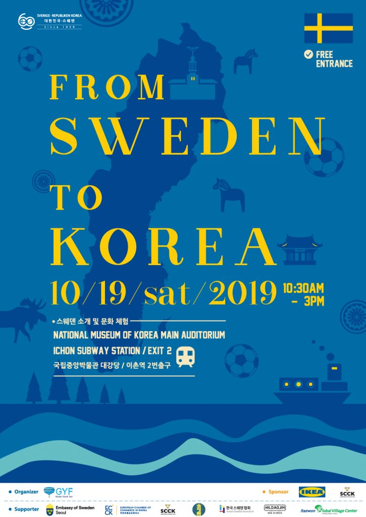 The Global Youth Fair (GYF) hosts “From Sweden to Korea,” its global youth cultural event on (Sat.) October 19, 2019 from 10:30 AM to 3:00 PM at the National Museum of Korea.