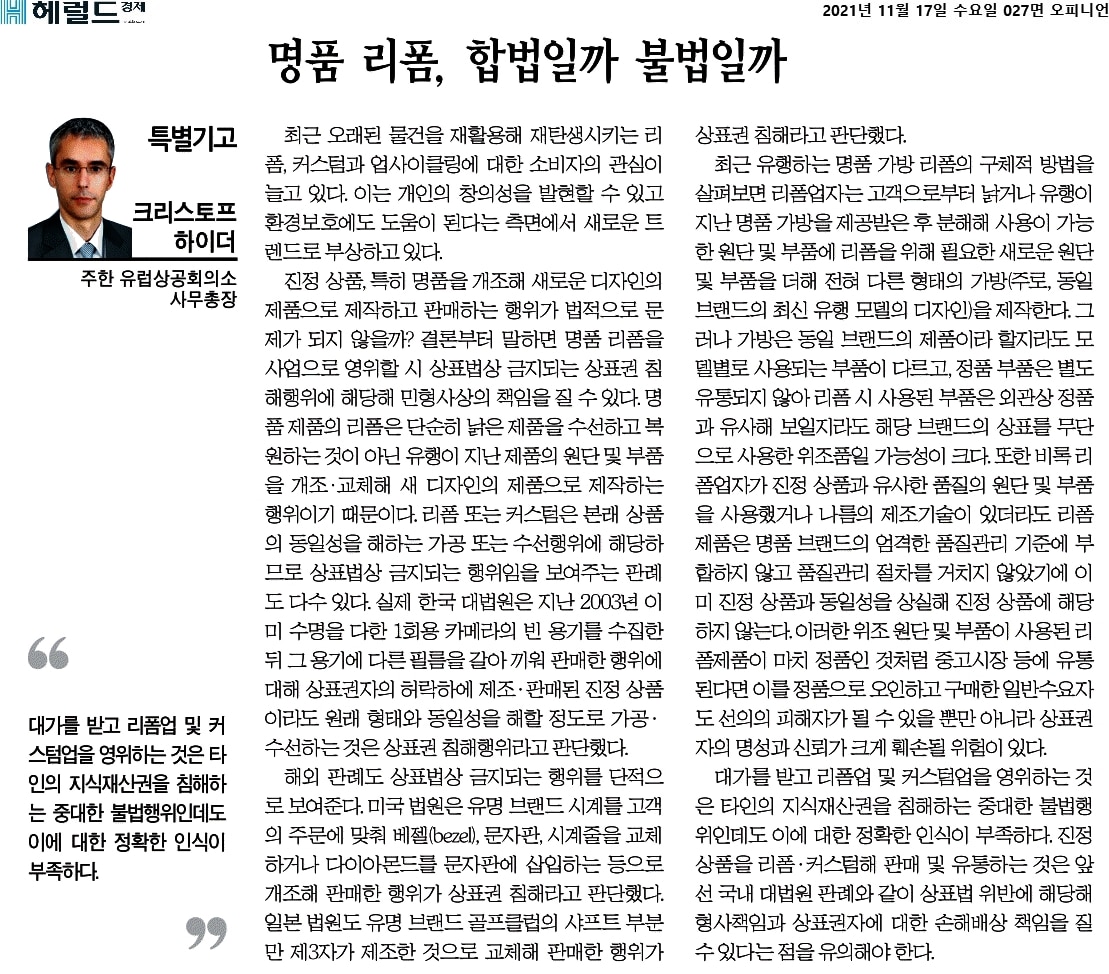 A column contributed by the ECCK President Christoph Heider has been published in Herald Biz on November 17. In the column president Heider talks about the issues regarding the reforming of luxury goods.