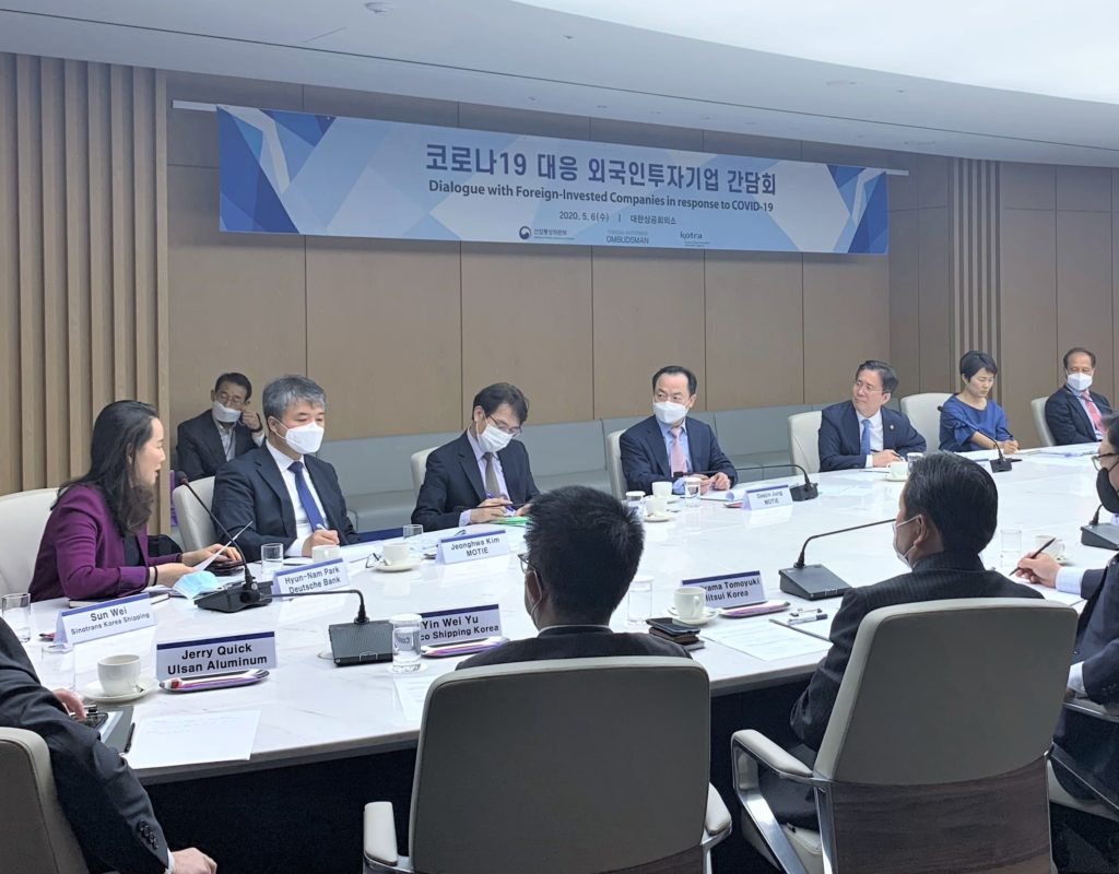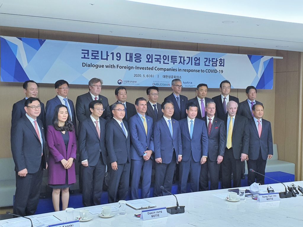 On May 6, ECCK participated in the roundtable meeting hosted by the Minister Sung Yun-mo of Ministry of Trade, Industry and Energy (MOTIE) to discuss ways to revitalize Korean economy in the post-corona era. The meeting was attended by MOTIE Minister Sung and representatives from foreign chambers in Korea including ECCK Chairperson Dimitris Psillakis, ECCK Vice-Chair Hyun Nam Park, and ECCK President Christoph Heider. The business representatives expressed appreciation towards the Korean government’s quick and efficient measures to combat the virus and pledged to commit towards Korea’s economic recovery. ECCK also shared recommendations on ways to support European companies operating in Korea.