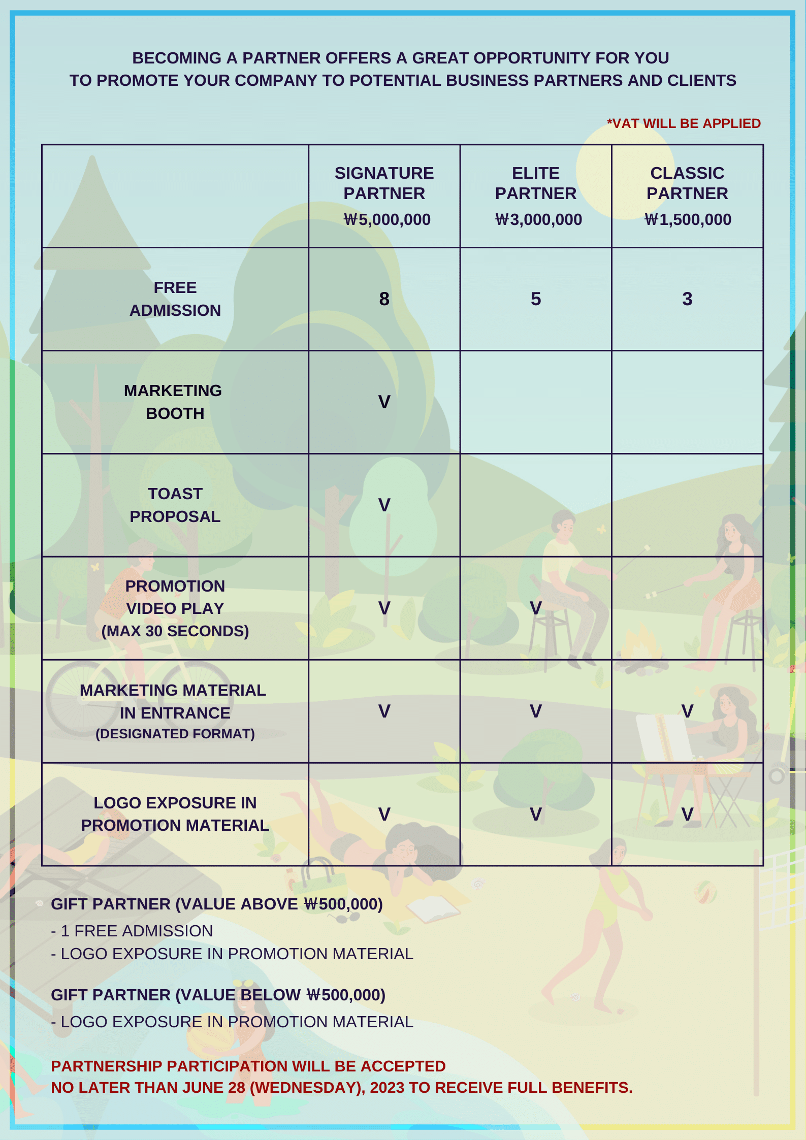 If you have interest to join as partner, please click this partnership proposal or see below image for more details. This partnership will be an excellent opportunity for you to promote and raise your company’s brand awareness to prominent audience in Korea. If you have any inquiry for the event or partnership, please contact ECCK Event Team. (event@ecck.or.kr, 02-6261-2711). Please confirm your partnership participation at your earliest convenience, but no later than June 28 (Wednesday), 2023 to receive the full benefit. We look forward to seeing you soon!