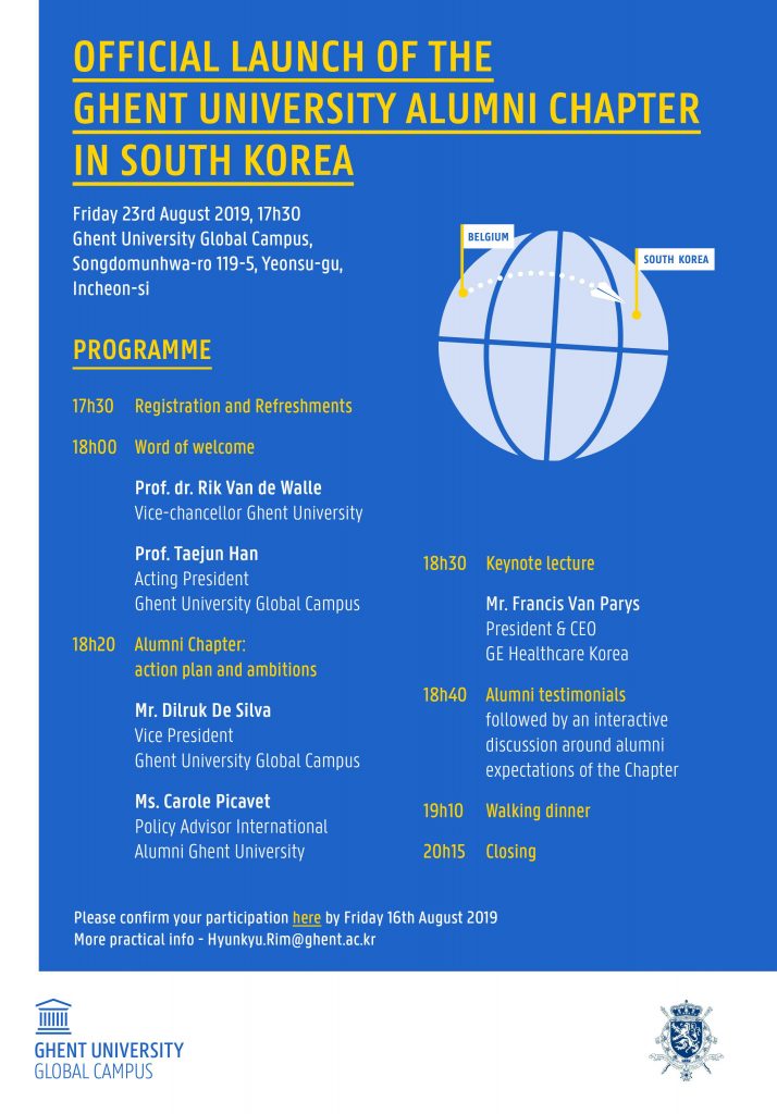 Ghent University invites you to the official launch of the Ghent University alumni chapter in South Korea. Please confirm your participation here by Friday, August 16, 2019. You can find out more through rk.ca.tnehg@miR.uyknuyH.