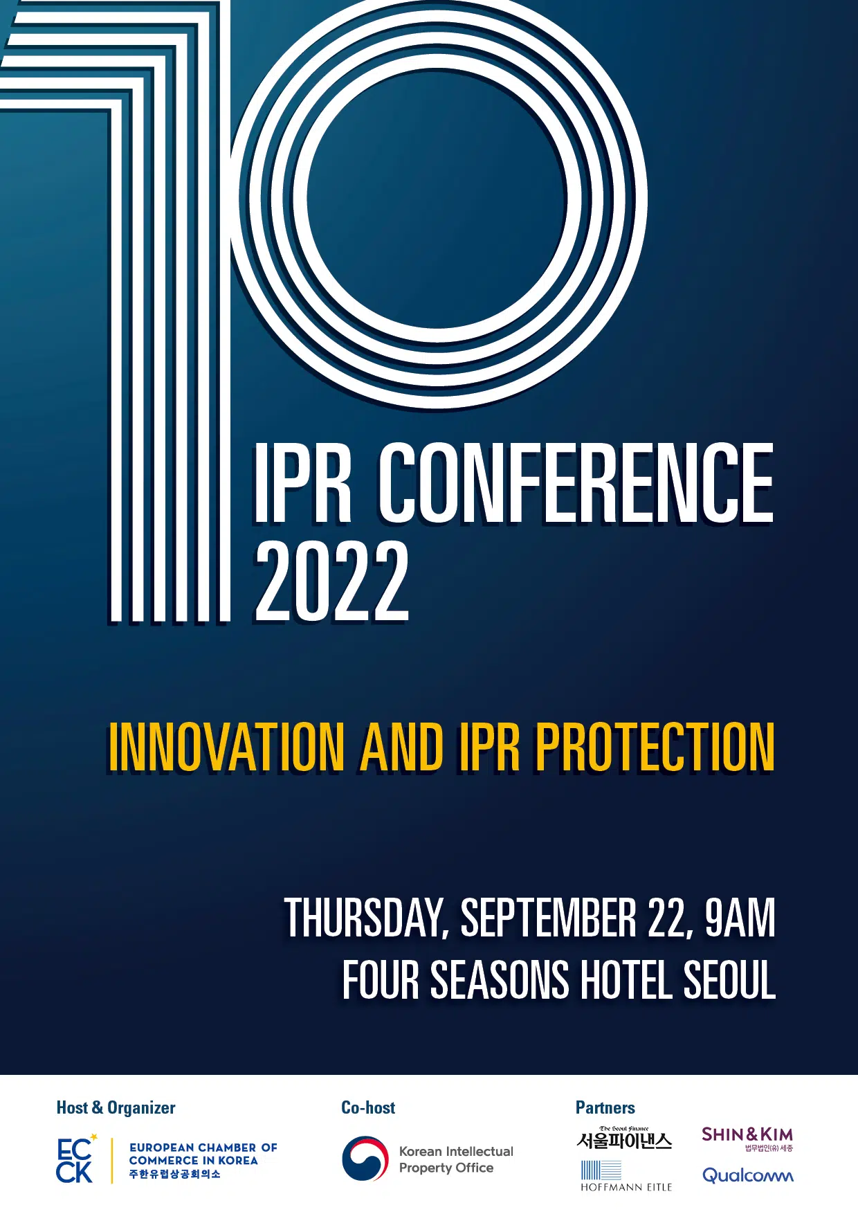 The 2022 IPR Conference is co-hosted by the European Chamber of Commerce in Korea (ECCK) and the Korean Intellectual Property Office (KIPO), and is supported by the Seoul Finance, Shin & Kim LLC, Hoffmann Eitle and Qualcomm Korea.