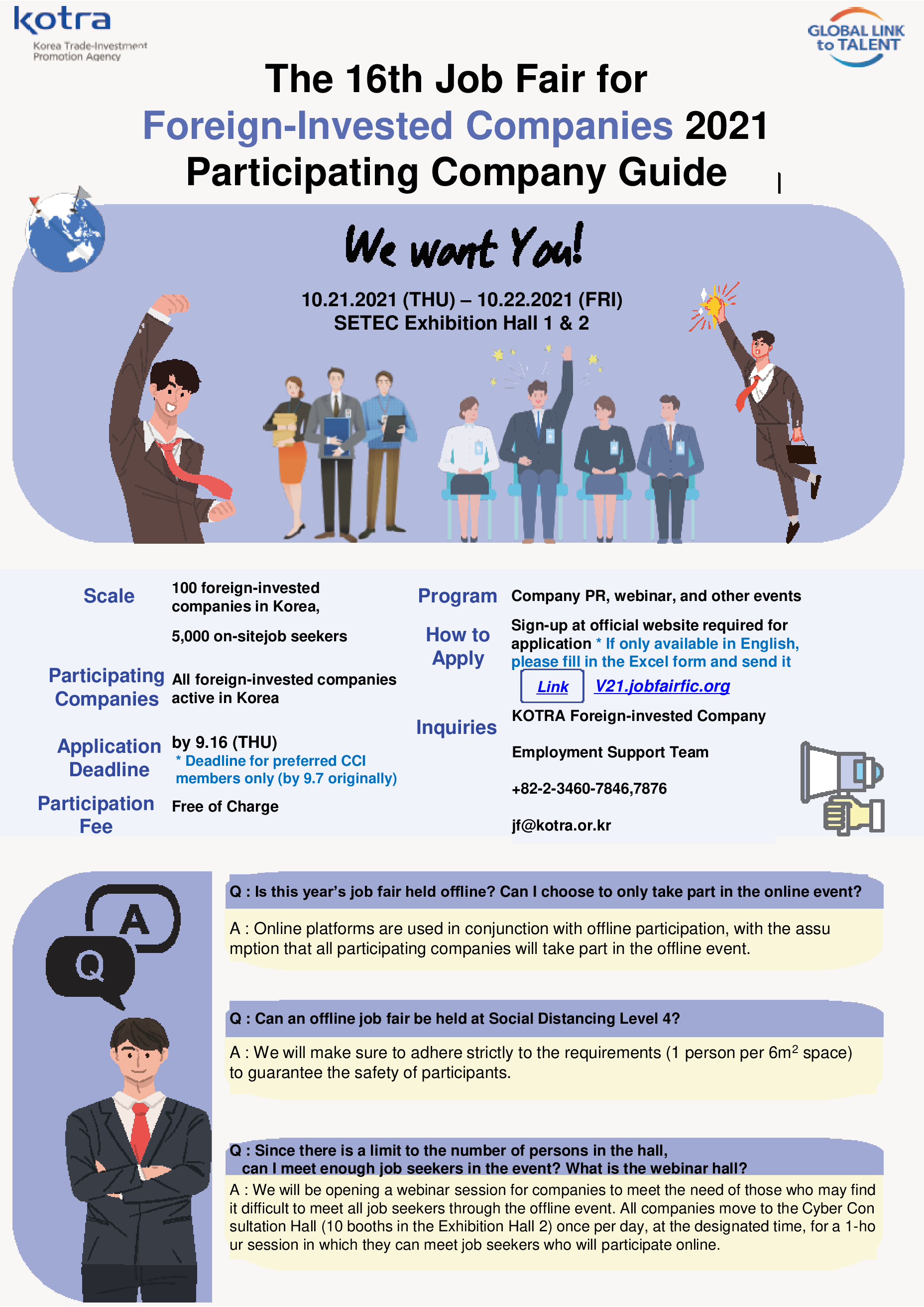 KOTRA is looking for foreign-invested companies in Korea that are interested in participating The 16th Job Fair for Foreign-Invested Companies 2021.