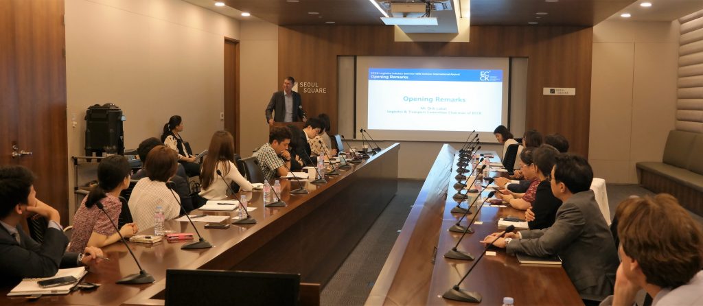 ECCK hosted the Logistics Industry Seminar with Incheon International Airport on August 29 at the ECCK office in Seoul. Joined by over 30 attendees from ECCK member companies, the seminar opened with welcoming remarks by Logistics & Transport Committee Chairman and CEO of Schenker Korea, Mr Dirk Lukat. Subsequently, Ms Jiyeoung Park, Senior Manager of Cargo Marketing Team at Incheon International Airport, gave a presentation on the overview of the Incheon airport and Incheon Free Trade Zone and its related issues including e-commerce BWT and Zero Tax Rate of VAT. Finally, a Q&A session was followed to clarify any subjects that were discussed during the meeting. We would like to thank Ms Park and all members who attended the seminar and hope to see you at the next ECCK Logistics & Transport Committee event.