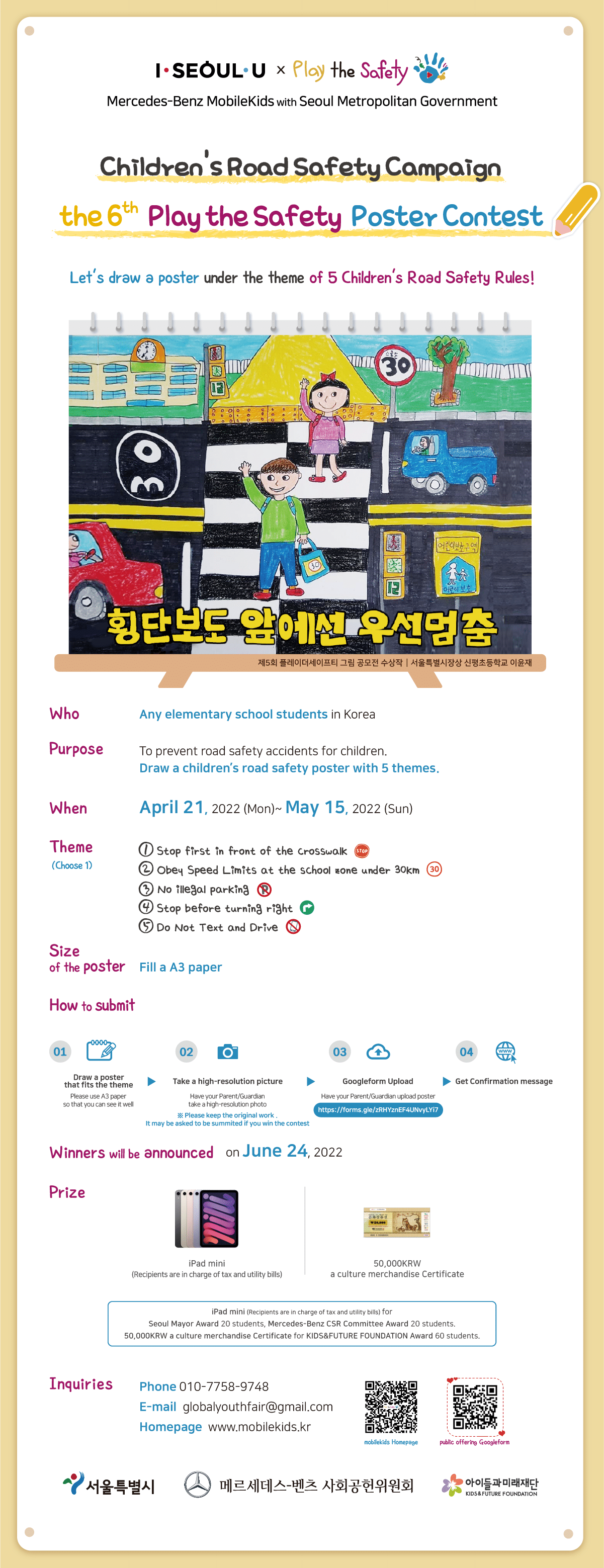 Mercedes-Benz Mobilekids in association with Seoul Metropolitan Government is to hold the 6th Play the Safety Poster Contest under the theme of ‘5 Children’s Road Safety Rules’.