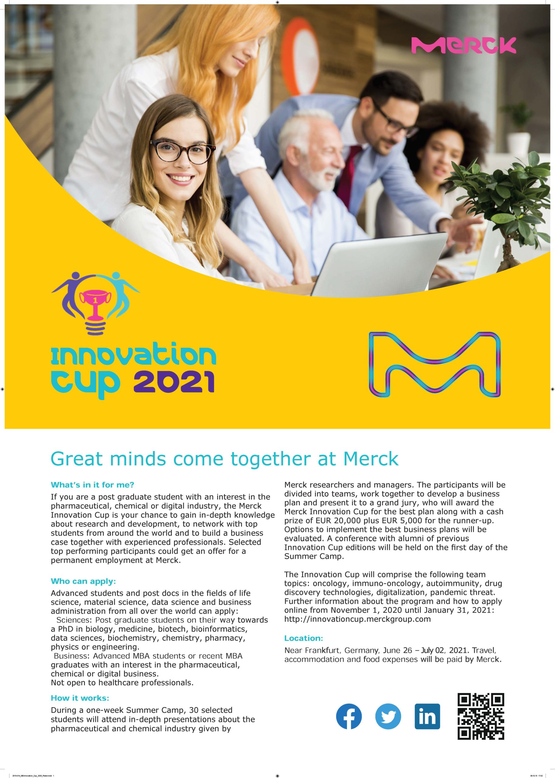 The Innovation Cup is an initiative for post-graduate students and young professionals in natural sciences, computer sciences, and business administration to attend a training program near Frankfurt, Germany. All travel, food and accommodation expenses are paid by Merck. The Innovation Cup is designed to support the professional development of post-graduate students interested in the pharmaceutical and chemical industry. Participants learn how R&D in the industry works by lectures from Merck managers and scientists. The students will also advance an idea to a full project plan with their team. The event brings together a promising new generation of talent with senior managers and researchers and accomplished retirees in a meeting of the generations. It also provides a unique chance to network with the brightest students from all around the world. Teams will work on innovative projects in the areas of: Oncology, Immuno-Oncology, Autoimmunity, Drug Discovery Technologies, Digitalization, and Pandemic Preparedness. At the first day of the summer camp a conference with alumni from previous editions of the Innovation Cup will be organized.