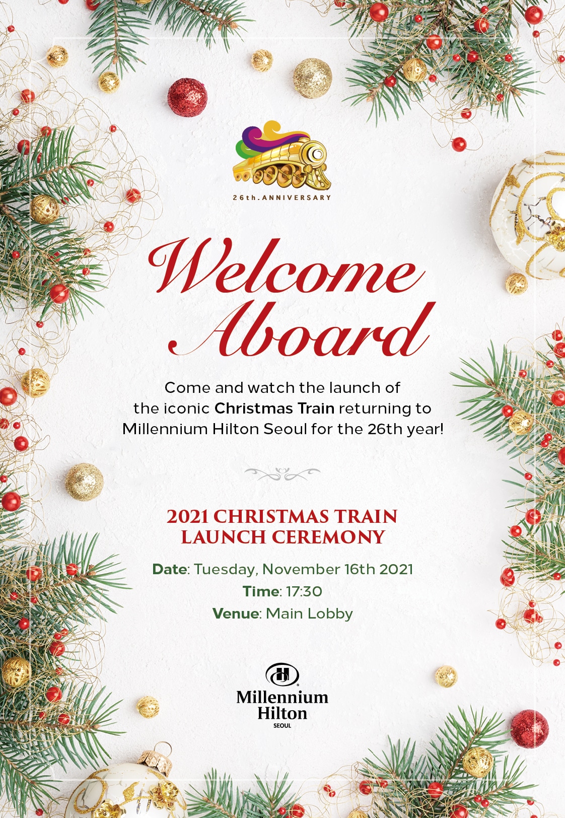 Millennium Hilton Seoul invites you to the 2021 Christmas Train Launch Ceremony! Come and watch the launch of the iconic Christmas Train returning to Millennium Hilton Seoul for the 26th year! Event Details Date: November 16, 2021 (Tuesday) Time: 17:30 Venue: Main Lobby