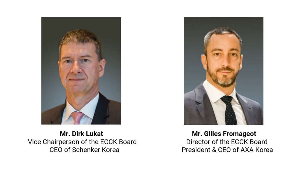 ECCK is pleased to announce its new board members. Mr. Dirk Lukat (CEO of Schenker Korea) has been appointed as Vice Chairperson of the Board. Also, Mr. Gilles Fromageot (President & CEO of AXA Korea) has been newly appointed as Director of the Board. We would like to sincerely congratulate them and are looking forward to their leadership.