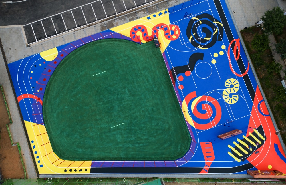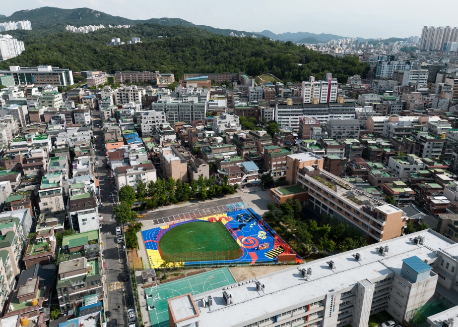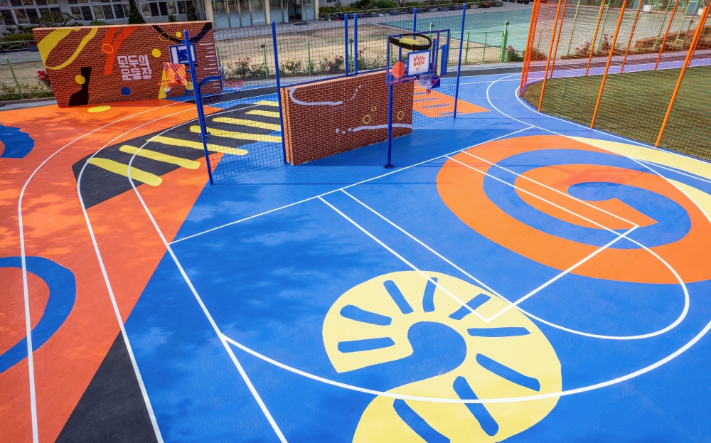 The design of the playground, with its vivid colors and a unique structure, was a collaborative effort with Joo-eon Jo from IMJ Design known for exploring novel social possibilities. Surrounded by a running track, the playground includes a basketball court, a futsal field, and a play zone for various games, creating an interactive ecosystem that offers a channel to communicate freely by connecting a variety of people.
