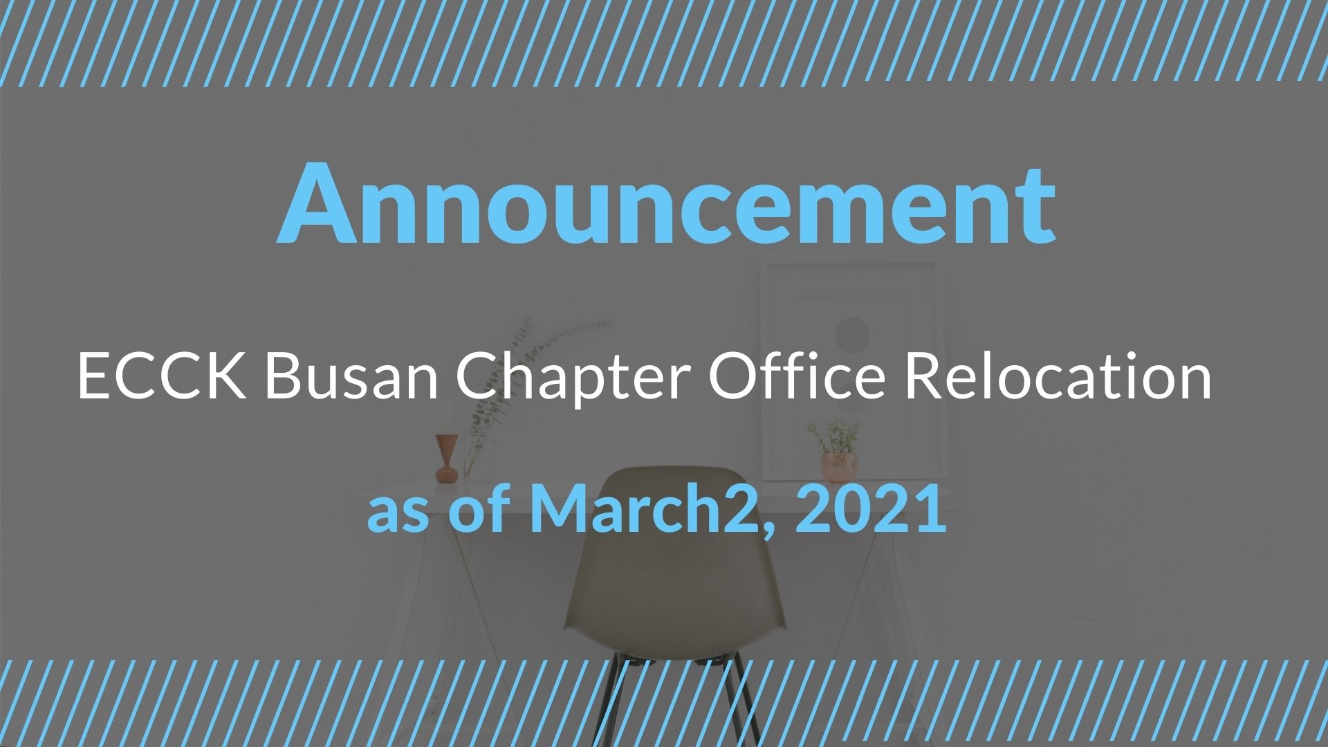 We are delighted to announce that effective from Tuesday, March 2, the ECCK Busan Chapter will be relocated to new premises. The new address is as follows: E8, #806, 30 Centumseo-ro, Haeundae-gu, Busan (48058) *The telephone number and email addresses will remain unchanged.