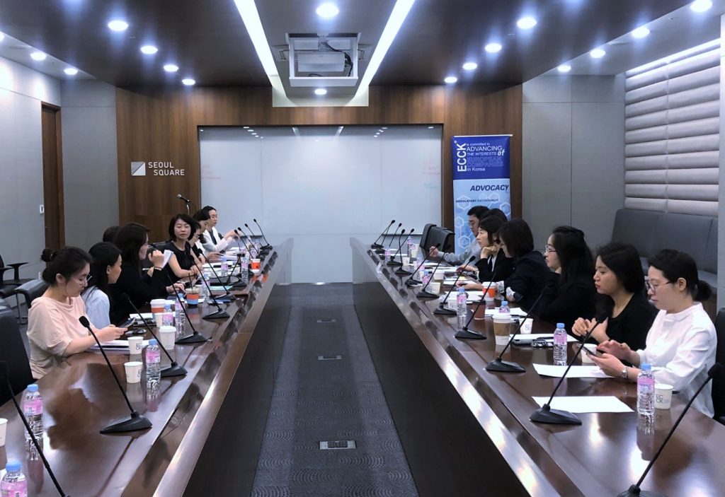 On August 30, ECCK Cosmetics Committee organized a roundtable meeting with Ministry of Food and Drug Safety (MFDS) Cosmetics Policy Division, the key office of handling Cosmetics Policies in Korea. The meeting was attended by Ms Mira Choi, Director of MFDS Cosmetics Policy Division, members of the Cosmetics Committee, and the Delegation of the European Union in Seoul.