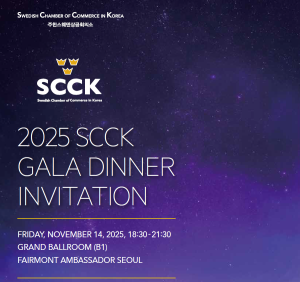 The Swedish Chamber of Commerce in Korea is pleased to invite you to their 2025 SCCK Gala dinner. Event Details Date & Time: November 14, 2025, *(Fri), 18:30 – 21:30 Venue: Fairmont Ambassador Seoul, Grand Ballroom (B1), (Naver link: here) Tickets: Table for 8 – KRW 2,300,000 (incl. VAT), Individual Member – KRW 250,000 (incl. VAT), Individual Non-Member – KRW 280,000 (incl. VAT) For any inquiries and ticket purchase, please contact Alex Ha, Managing Director of SCCK, via scckinseoul@gmail.com or 010-3755-0423.