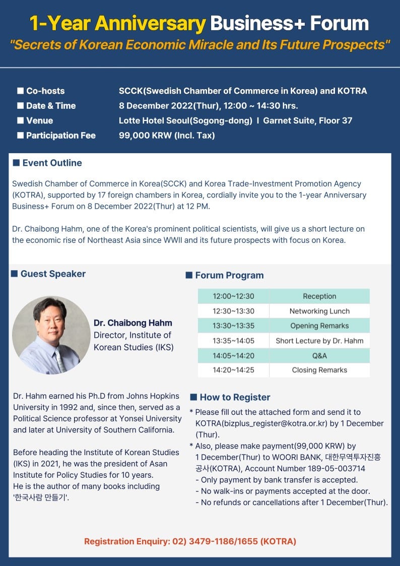 Swedish Chamber of Commerce in Korea and KOTRA is to co-host a Buness+ Forum under the theme “Secrets of Korean Economic Miracle and Its Future Prospects”