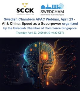 The Swedish Chamber of Commerce in Korea (SCCK) invites you to the Swedish Chambers APAC Webinar ‘AI & China: Speed as a Superpower’ on April 23, organized by the Swedish Chamber of Commerce Singapore (SWEDCHAM).