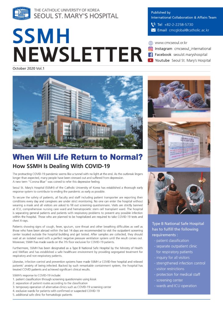Seoul St. Mary’s Hospital has newly published an English Newsletter for international patients. This quarterly newsletter provides updates on the latest news of Seoul St. Mary’s Hospital and useful medical information which you will find very much helpful. You can also learn about our International Health Care Center, a dedicated center for international patients who are living and traveling in Korea.