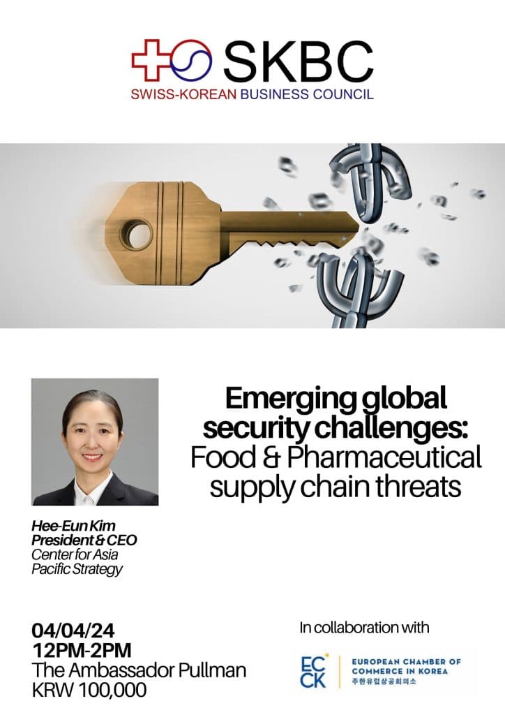 For this event, we are looking forward to welcome: Ms. Hee-Eun Kim, President and CEO of the Center for Asia Pacific Strategy will speak on Emerging global security challenges: Food & Pharmaceutical supply chain threats. Join us for a crucial presentation and discussion on “Emerging Global Security Challenges: Food & Pharmaceutical Supply Chain Threats.” Explore the vulnerabilities in our interconnected world, specifically within the vital food and pharmaceutical supply chains. The cost of the luncheon is KRW 100,000 VAT included.