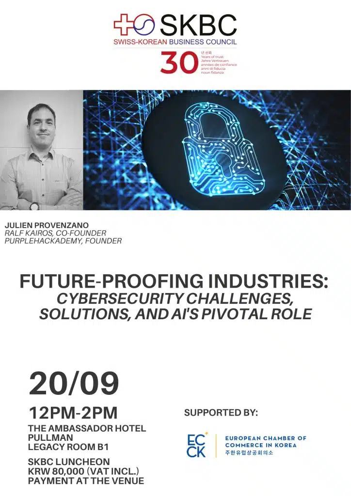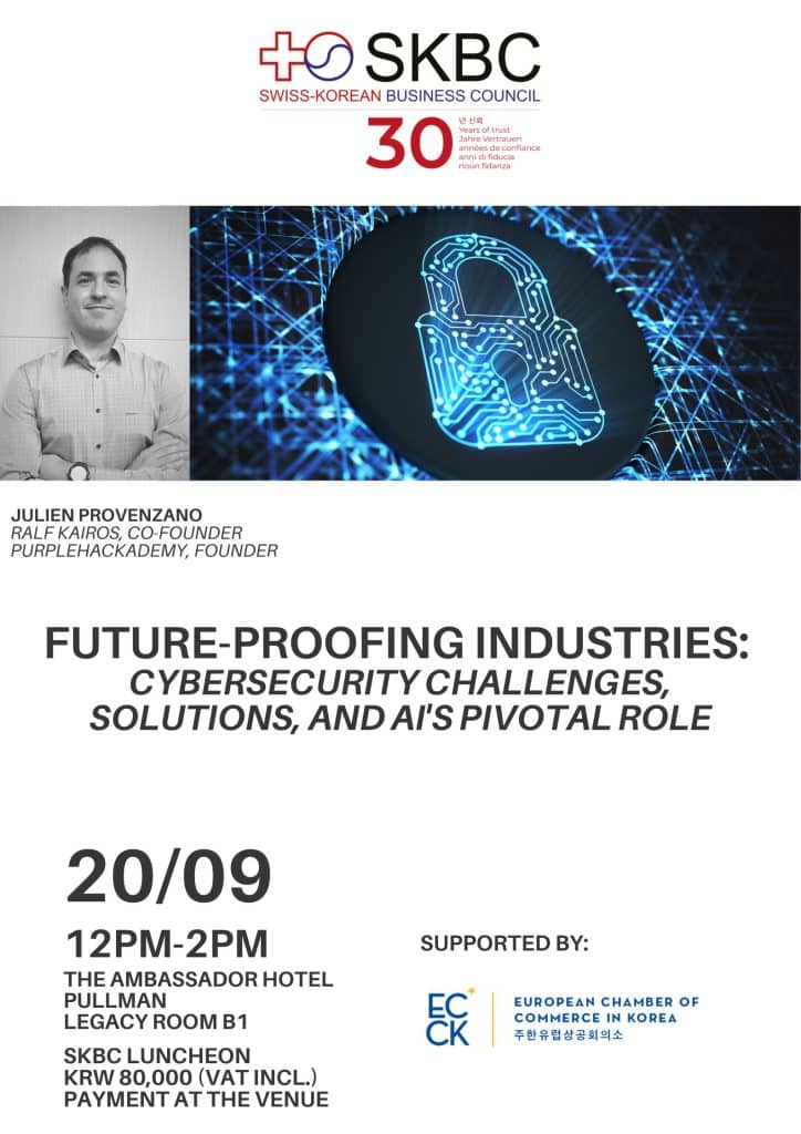 SKBC cordially invites ECCK members to its ‘Future-Proofing Industries: Cybersecurity Challenges. Solutions, and AI’s Pivotal Role’ event. For this event, we are looking forward to welcoming Julien Provenzano, Ralf Kairos, Co-Founder and Purple Hackademy, Founder. Please see below for detailed information.