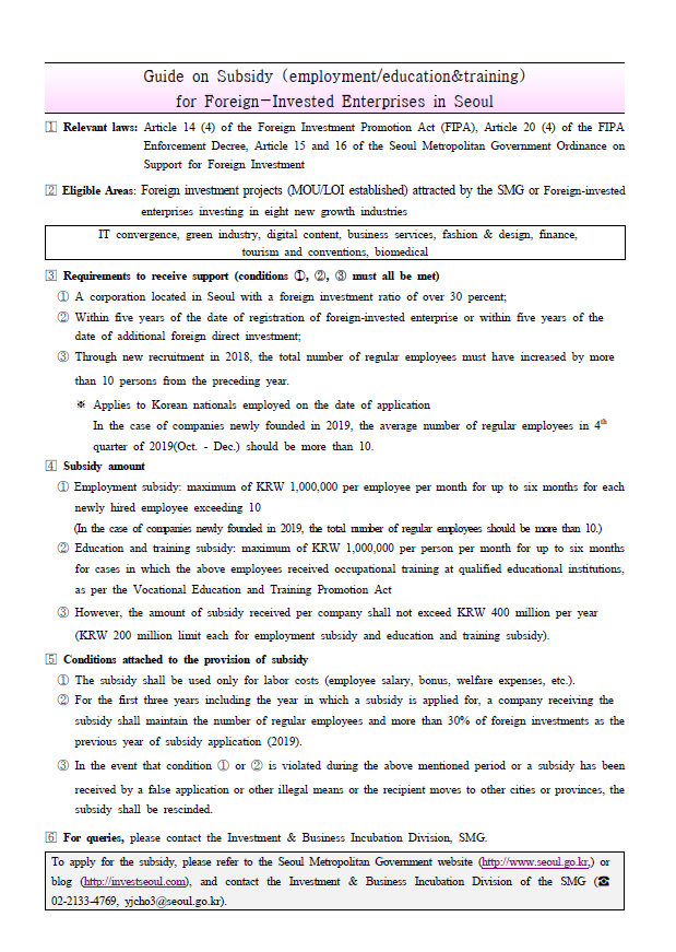 In accordance with Article 14 of the Foreign Investment Promotion Act (FIPA), Article 20 of the FIPA Enforcement Decree, Article 15 and 16 of the Seoul Metropolitan Government (SMG) Ordinance on Support for Foreign Investment, the SMG offer notification of the plan, to provide subsidies for employment, education, and training for foreign-invested enterprises in Seoul. Eligible companies are kindly requested to submit an application for subsidy.