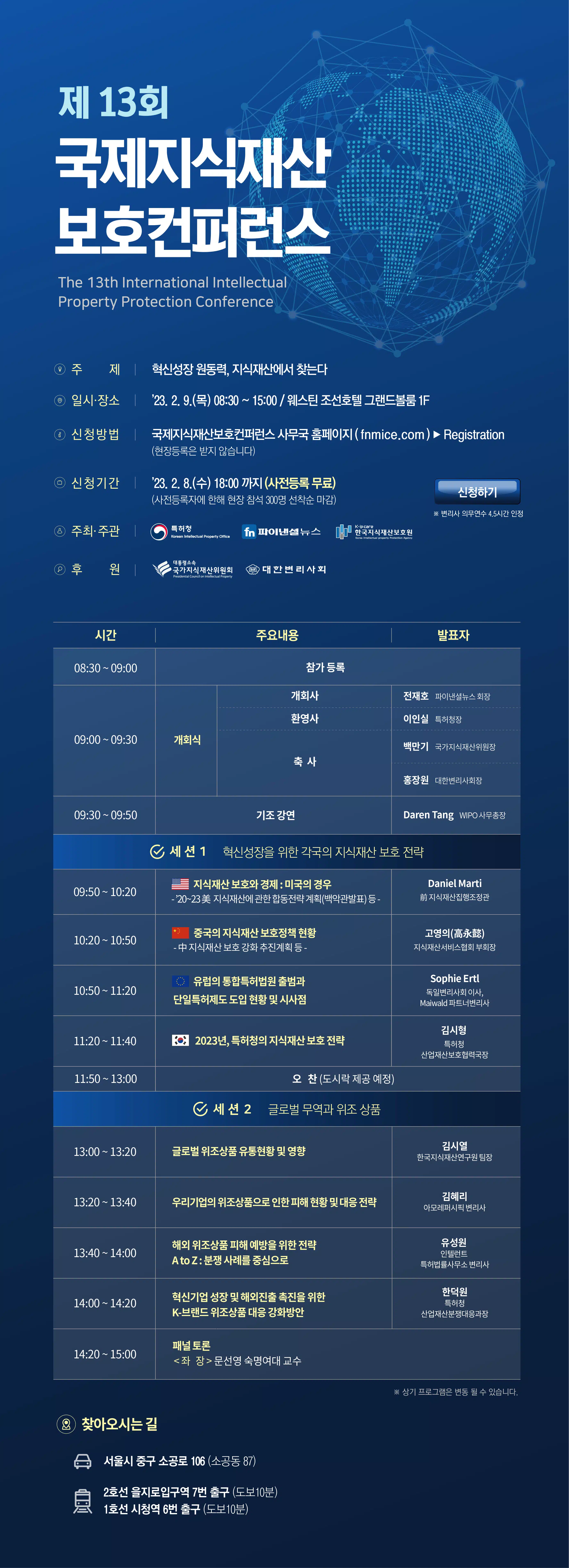 Theme: Intellectual Property, the Driving Force of Innovative Growth Date: Thursday, February 9, 09:00 – 15:00 Venue: Grand ballroom, The Westin Josun Seoul (1F) Host: The Financial News, Korean Intellectual Property Office Organizer: Korea Intellectual Property Protection Agency Sponsor: Presidential Council on Intellectual Property, Korea Patent Attorneys Association Registration: by Wednesday, February 8, 18:00 (pre-registration is free of charge)