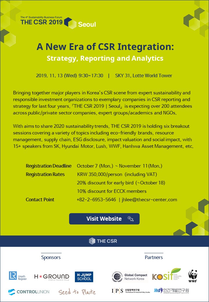 A sustainability consultancy firm, THE CSR Co., is hosting its 4th sustainability business forum 『THE CSR 2019 | Seoul』 in November 13 (Wed). Bringing together major players in Korea’s CSR scene from expert sustainability and responsible investment organizations to exemplary companies in CSR reporting and strategy for last four years, 『THE CSR 2019 | Seoul』 is expecting over 200 attendees across public/private sector companies, expert groups/academics and NGOs. Please visit forum’s official website (www.thecsr-forum.com) and find more details on program, speakers, etc.