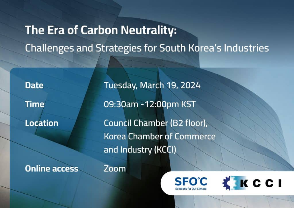 Next Tuesday, March 19, 2024, the Korean Chamber of Commerce and Industry (KCCI) is pleased to invite its members and relevant industry stakeholders to attend a special industry seminar “The Era of Carbon Neutrality – Challenges and Strategies for South Korea’s Industries”. During the session, industry experts and policy practitioners from various industries will come together to share their expertise on decarbonization and corporate climate leadership. For those who are interested in this event, please refer the event details as below: