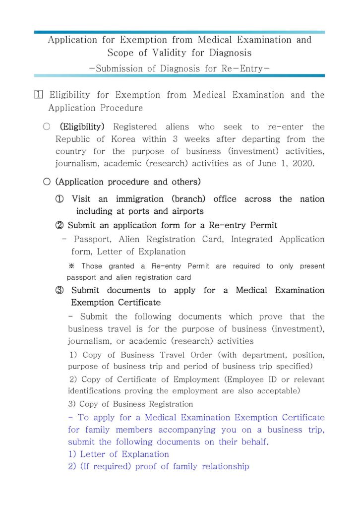 ⑤ Those with a ‘Medical Examination Exemption Certificate’ shall be exempted from the obligation to undergo a medical examination and to submit a diagnosis for Re-entry into the ROK.