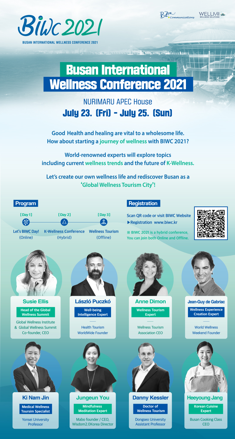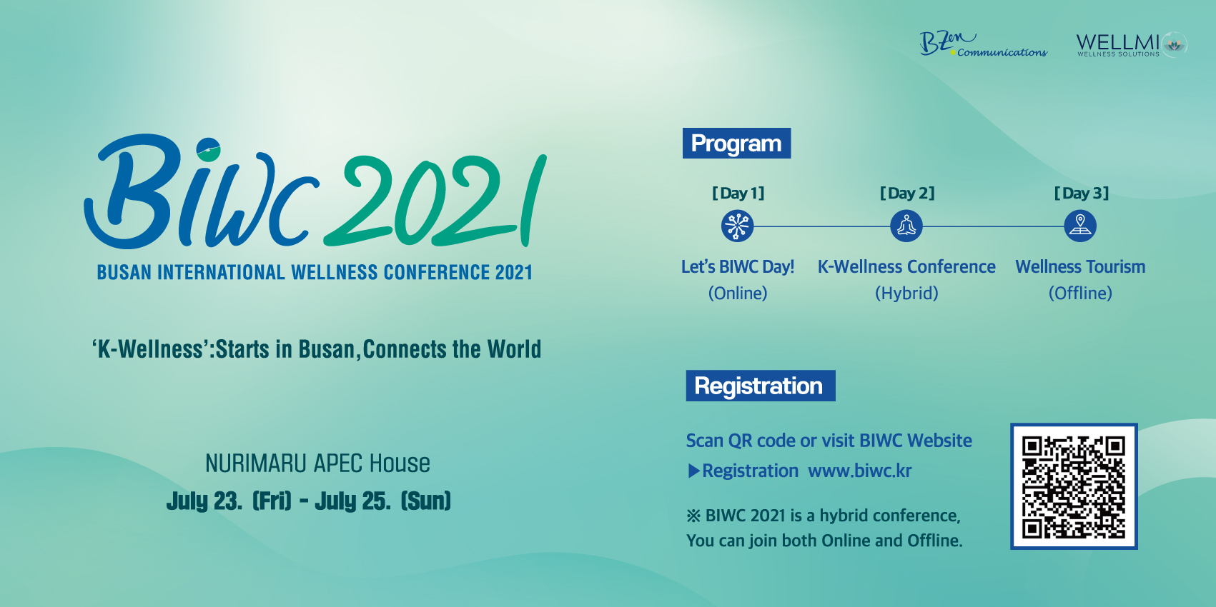 Under the theme [‘K-Wellness’: Starts in Busan, Connects the World], BIWC2021 takes place as a hybrid event from July 23(Fri)-25(Sun) both on and off-line at the Nurimaru APEC House and healing Busan tourist sites. BIWC 2021 has grown to include events such as the Let’s BIWC Day, Keynote speeches, K-wellness seminars, mini-wellness classes, industry networking, a talk concert, a wellness village and B-MICE wellness tours, right in the heart of Busan.