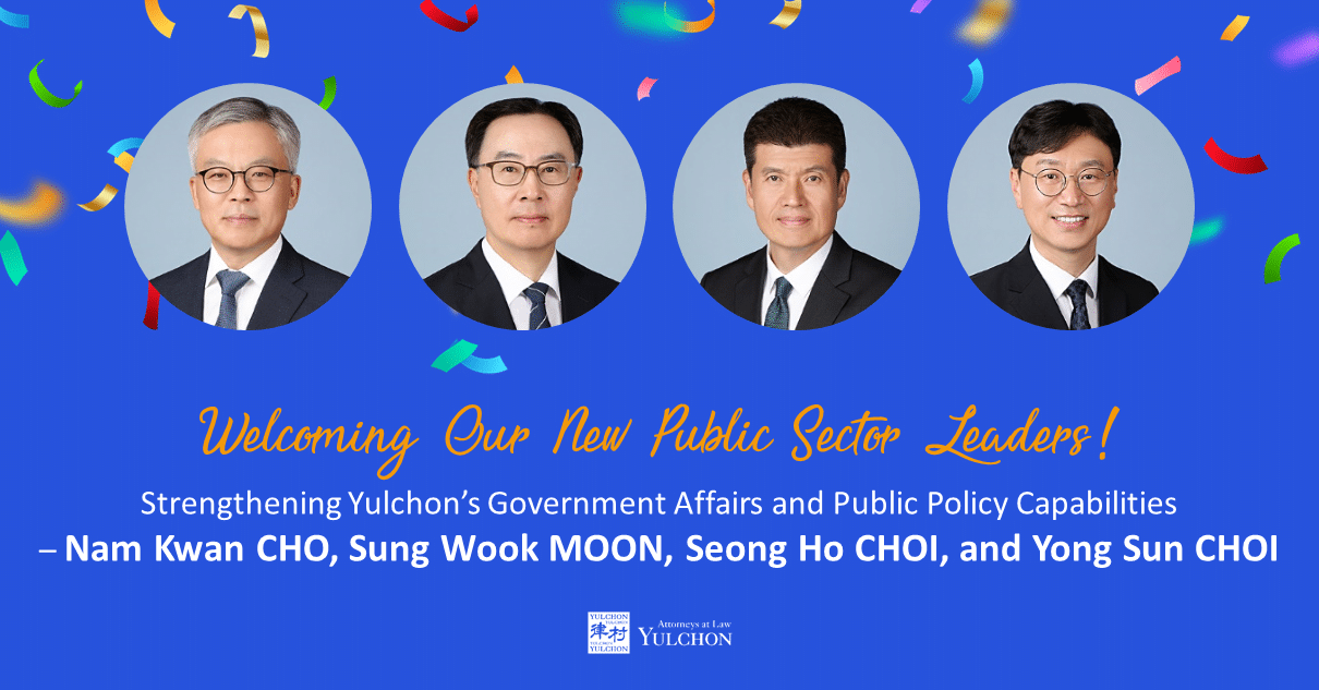 Yulchon LLC is pleased to announce the addition of several high-profile professionals with extensive public-sector experience, as part of the firm’s broader initiative to strengthen its government affairs, regulatory advisory, and policy-related service offerings. These appointments underscore the firm’s strategic commitment to helping clients anticipate and navigate regulatory and administrative developments with insight and agility.